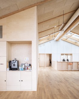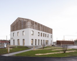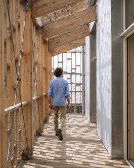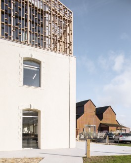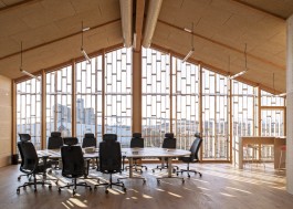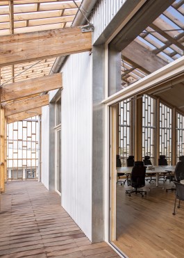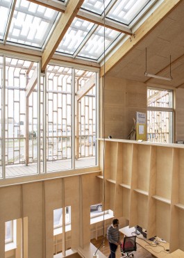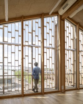 La rénovation se structure autour de deux découpes franches : une verticale pour la trémie et une horizontale pour l’arasement. Contre le refend, les planchers bois sont ouverts en un atrium transversal et toute hauteur. Ce vide induit de nouvelles qualités d’usages. Il diffuse un confort lumineux et des flux simplifiés dans le bâtiment. Au dernier niveau, la surélévation prolonge la logique et les qualités des étages inférieurs. Autour de l’atrium, un espace de réception, des salles de réunion et des terrasses-belvédère regardent le grand paysage industriel. Pour ne pas bouleverser la structure existante, la charpente repose directement sur les façades sans reprise intermédiaire. Elle forme un exosquelette de bois, habillé de modules de résille, filtrant les vues. Depuis l’extérieur, ce moucharabieh joue sur les perceptions cinétiques. Selon le point de vue, ce monolithe sans échelle fait écho aux volumes des hangars voisins ou révèle une dentelle bois.
