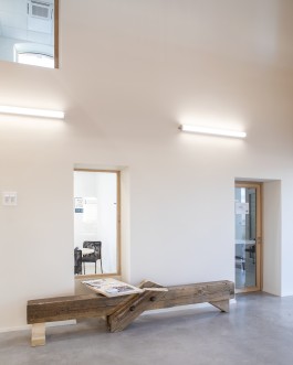Dès la conception, le projet s’inscrit dans une démarche de réemploi. Le mobilier de bureau, réalisé par Fichtre, transforme ainsi les anciens bureaux de l’entreprise en grandes tablées pour les travailleurs de passages. Les matériaux déposés sont réinvestis : la charpente est réutilisée en bancs et les tuiles empilées de la couverture deviennent les murs moucharabieh de l’abri vélo.