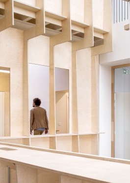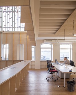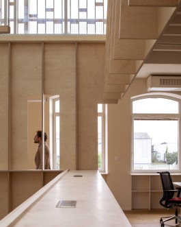 L’atelier Fichtre est associé à la démarche architecturale pour appuyer la sensibilité du projet par leur regard artistique et conforter une ambiance globale unifiée. Ils proposent un garde-corps en bois cernant l’atrium à la façon d’un décor de théâtre inversé. Par son côté massif, il crée une barrière acoustique et séquence les déambulations. En lien, de généreux placards bois épaississent les parois existantes. Ils mettent à l’abri des zones de travail de l’atrium et offrent du stockage aux travailleurs nomades. Ces dispositifs favorisent les vues longues et structurent la circulation entre les différents espaces.