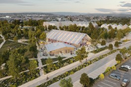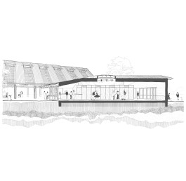 Le projet s’inscrit comme un élément fédérateur de la nouvelle ZAC de Carrière-sous-Poissy. Il fait le lien entre un boulevard structurant et une coulée verte. La halle polyvalente est donc traversante entre le boulevard et une place piétonne intimisée et ouverte sur le parc paysager. Sur son pignon Sud, elle travaille un parvis par retrait, sur son pignon Nord, elle s’ouvre à une cour logistique. Ces façades intègrent des portes battantes qui permettent à l’équipement de maîtriser ses flux selon les occupations.