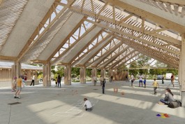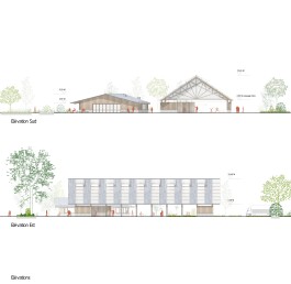 L’ensemble est de conception pérenne et vertueuses. les 2 bâtiments se posent sur des soubassements en béton qui permettent le hors d’eau des bardages et charpente bois, et forment des assises et des guichets. Les parties isolées sont en murs ossatures bois remplis de paille et enduit de terre à l’intérieur.