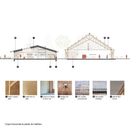 Chaque angle de la halle prévoit des locaux de rangement intégrés dans une épaisseur structurelle qui forme un seuil. Sa charpente permet une portée libre, les fermes intègrent, à la façon de SHED des bandes lumineuses en polycarbonate, et des brises soleils bois intérieurs.