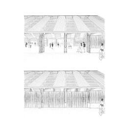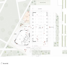 Le long de la halle, en pivot entre parvis sud et place piétonne, une salle polyvalente propose des façades animées à l’espace public : salle de réunion, salle associative et de convivialité, bar. Le bâtiment abrite aussi des zones techniques communes.