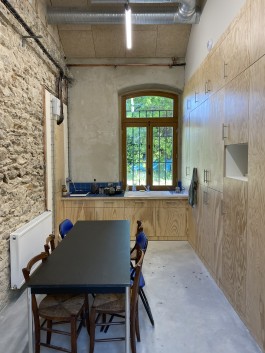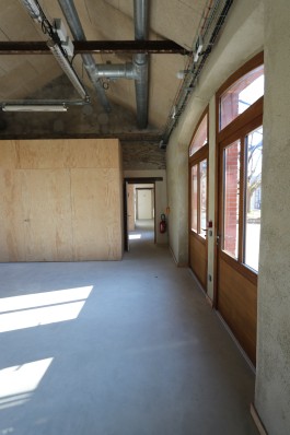 Les volumes intérieurs dosent aspect brut et interventions soignées. Dans les salles isolées en béton de chanvre, des boites neuves en ossature bois isolées créent des espaces de travail chauffés et abrités des ateliers bruyants. Le projet adopte volontairement une esthétique du réparé, de l’économie de moyens et matière. Il défend une durabilité par le soin.