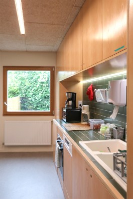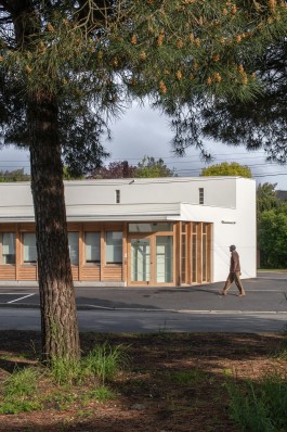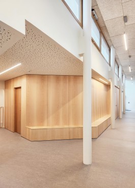 Les espaces intérieurs ont été repensés pour offrir un environnement sécurisant et accueillant, favorisant le bien-être des usagers. Les aménagements intérieurs en bois forment des partitions verticales qui structurent l’espace et apportent une ambiance chaleureuse et apaisante.