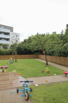 La requalification implante les chambres des bébés à l’arrière sur un jardin sécurisé, et les bureaux côté rue, derrière une façade neuve en bois.